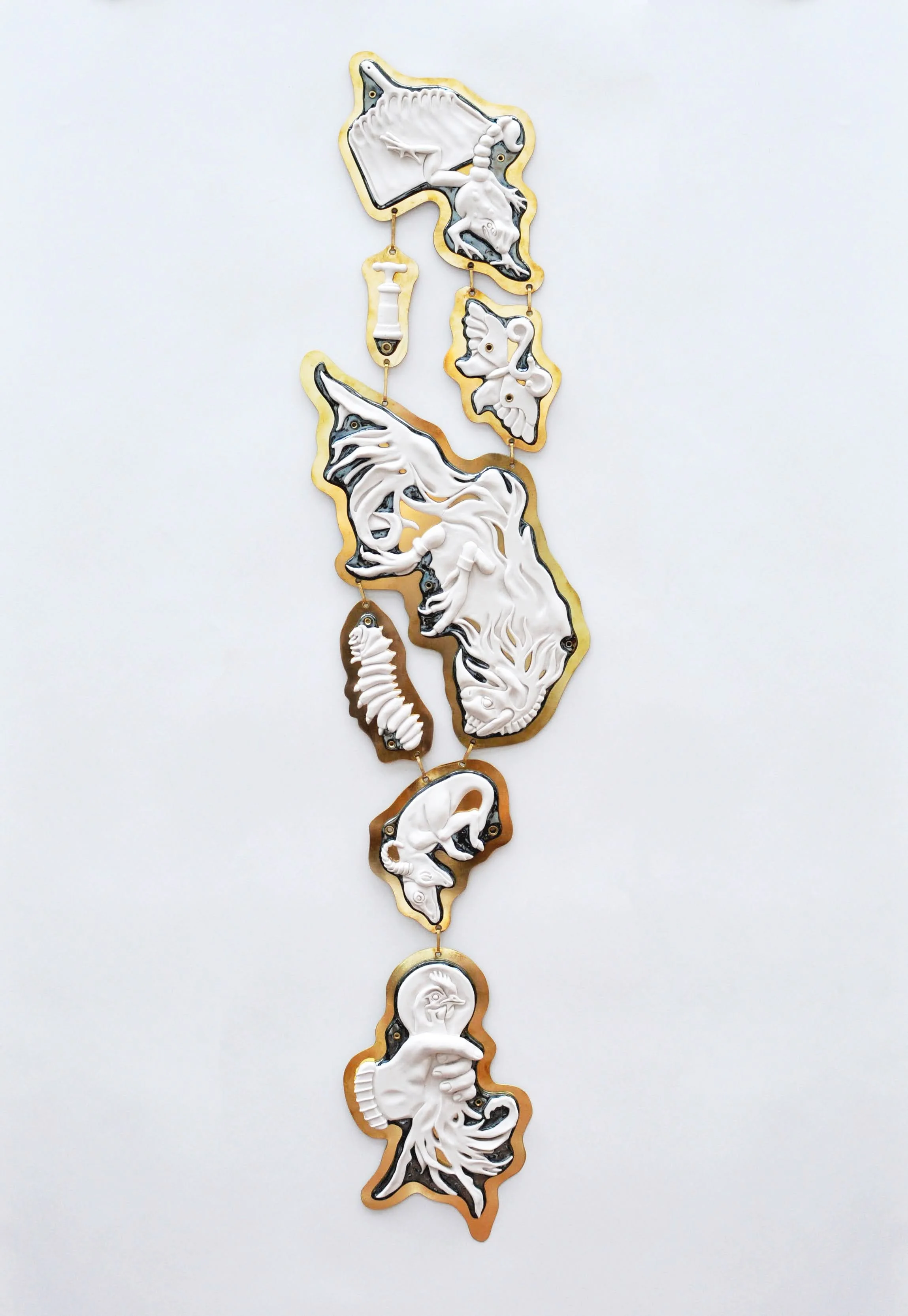 In a literal and poetic sense, vessels function as mediators in the interactions that they might symbolize or facilitate. The sculptural vessel forms I make are hand-built and adorned with relief carvings and cast details of vernacular objects such as deer hooves, peach pits, puzzle pieces, electric fencing insulators, tools, and toys. Animals are often rendered in ambiguous states of metamorphosis, hunt, or performance. The work’s layered surfaces are built through multiple firings and often incorporate metal components. In two-dimensional works, the carved porcelain imagery is mounted on metal. Employing jeweler’s techniques on a large scale, these works resemble engraved charms. Referencing objects of protection and historical depictions of infernal and sublime landscapes, they imagine possibilities of connection between wild and domestic realms, between chaos and play, and hybridity as an emblem of resiliency.